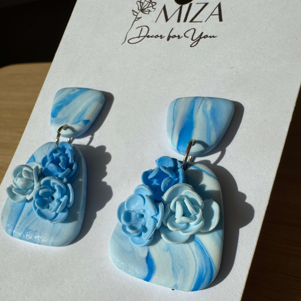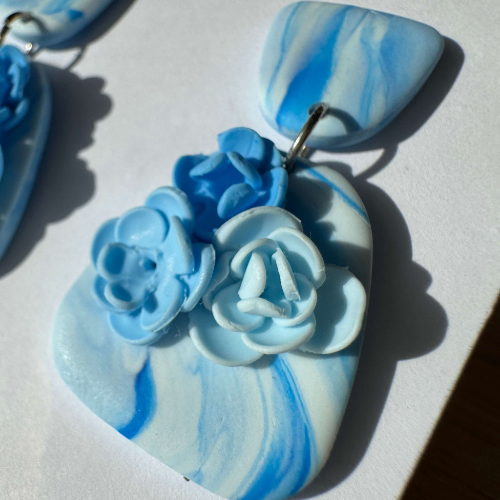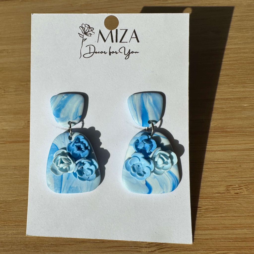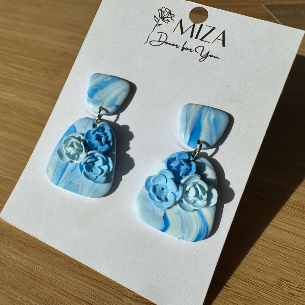 2 részes tompa trapéz fülbevaló - Világoskék-fehér márvány mintás virágokkal