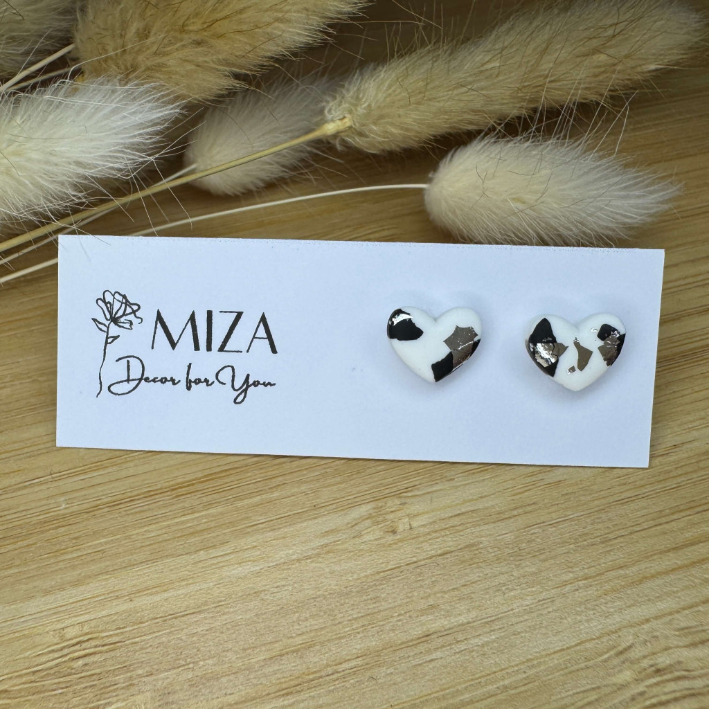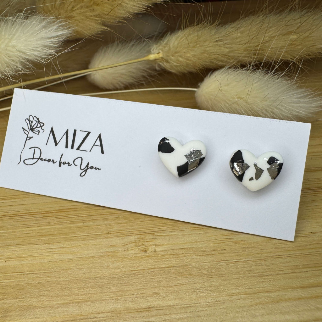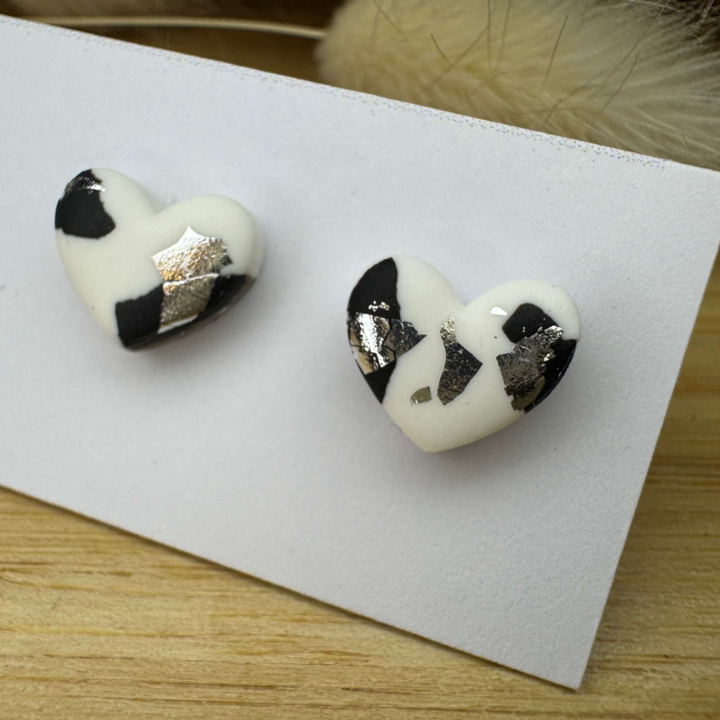 Szív bedugós fülbevaló - fekete-fehér-ezüst tarka